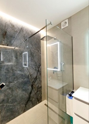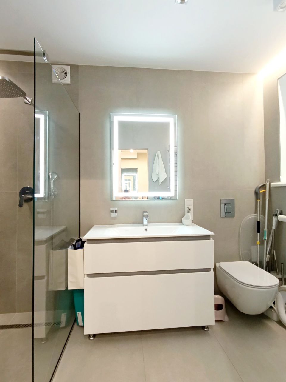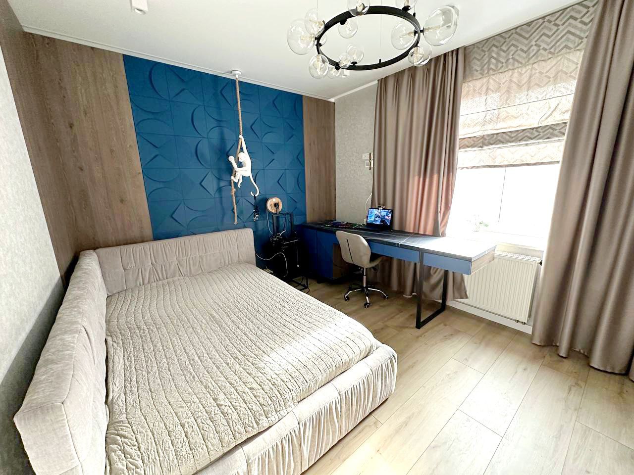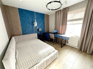 1.5 поверх: дві спальні дитячі 16.3 і 14.2 м2 з великими вмонтованими шафами під речі, і 3.9 м2 – санвузол з душовою кабіною спеціально під лаштований для дітей (під їхній зріст).