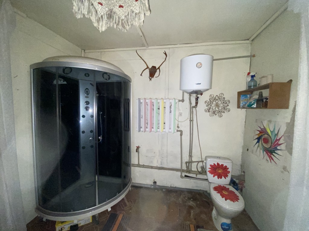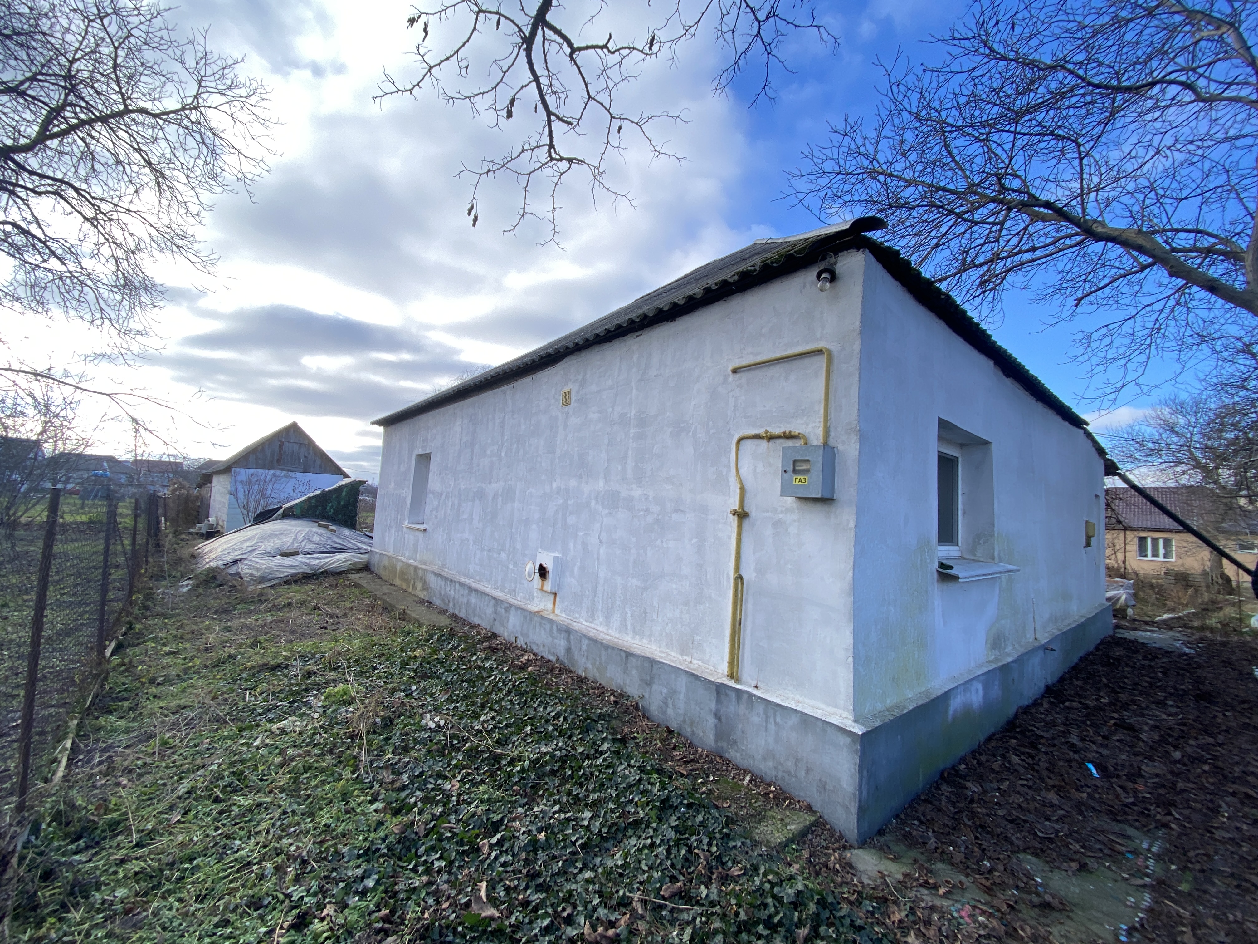 На ділянці є старенький будинок у житловому стані (площа 53,1 м2, дві кімнати), побудований з дерева, обкладений цеглою, утеплений пінопластом і поштукатурений. Опалення газове. Також є сарай із шлакоблоку, погріб.