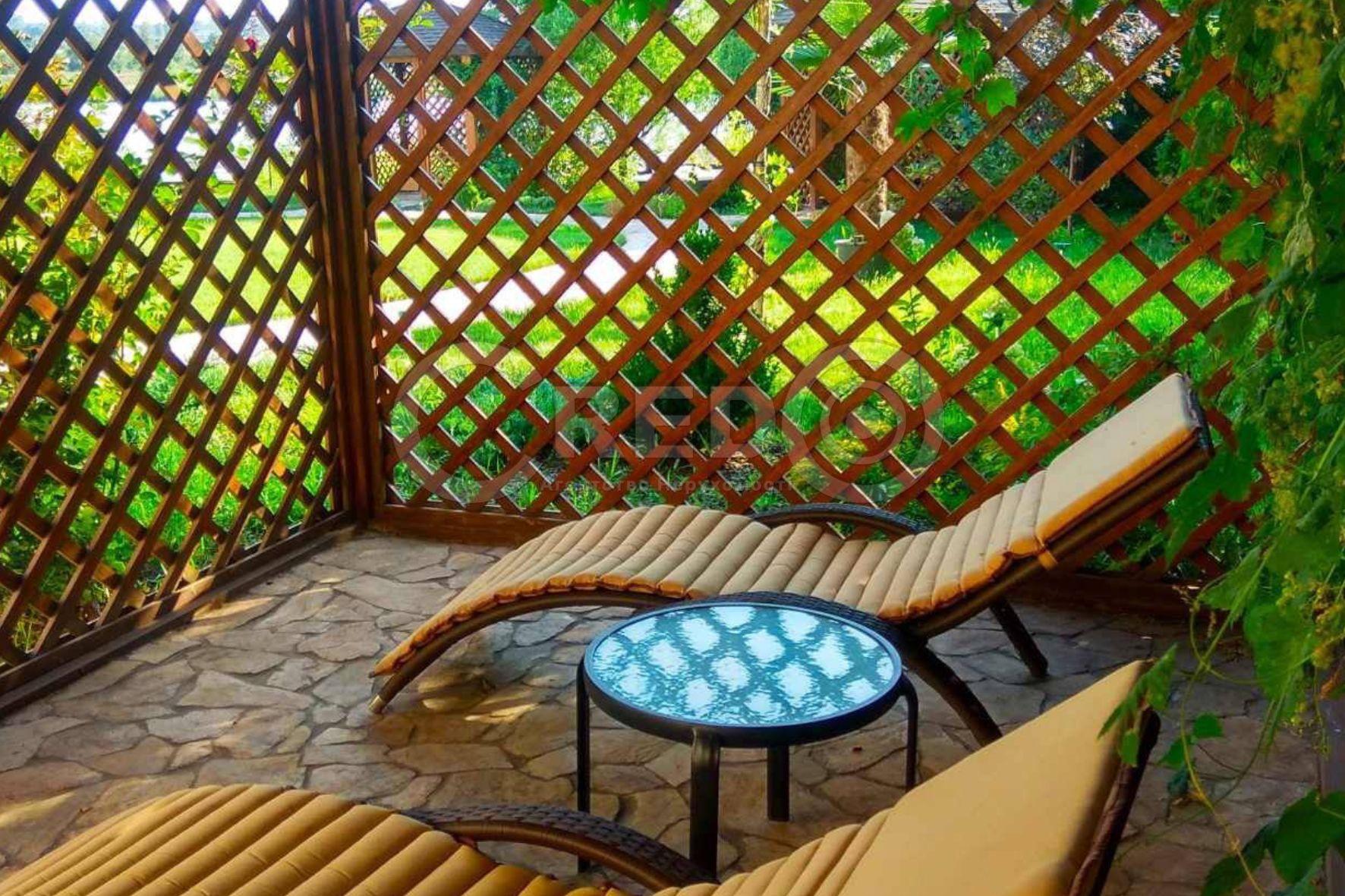 Технічні характеристики: - Сучасні номери, кожен з власним дизайнерським стилем - Обладнанні меблями, технікою та предметами інтер’єру. - Три входи - Цоколь - граніт - Великий хол - Тераса - Спортивна зала - Сольова кімната з Гімолайською сілью - Роздягальня з душовою - Міні кінотеатр з фіто баром - Хамам з джакузі - Кабінет лікаря - Пральня - Зона відпочинку - Зимовий сад - Бесідки - Топочна - Тротуари вимощені натуральним, гранітним каменем "Брекча" - Двері натуральне дерево - Кований паркан - Меблі під заказ - Нова криша