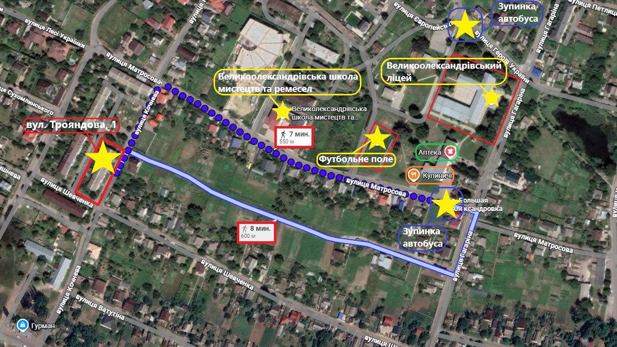 Поруч ліцей, школа мистецтв, дитячий садок, футбольне поле, аптека, Нова Пошта, Укрпошта. Базар в центрі 2-3 рази на тиждень. Зупинка автобуса на Київ- 600м, до електрички- 20хвилин пішки (зупинка Чубинський), до метро Бориспільська 20хв їзди маршруткою.
