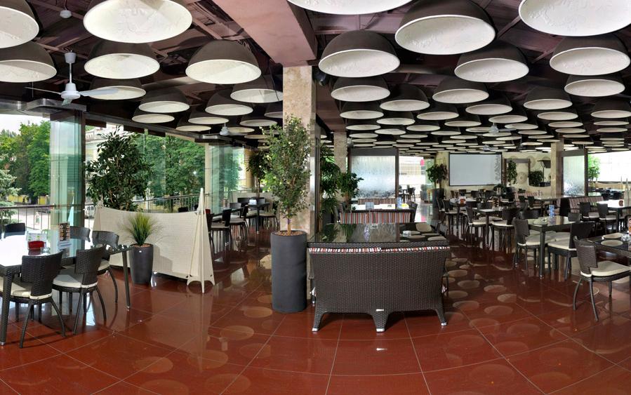 Зеленые, легкие, великолепные летние террасы с прекрасными видами на парк, качественной отделкой. Ресторан оборудован современной стильной мебелью, дизайнерское решение пространства.
