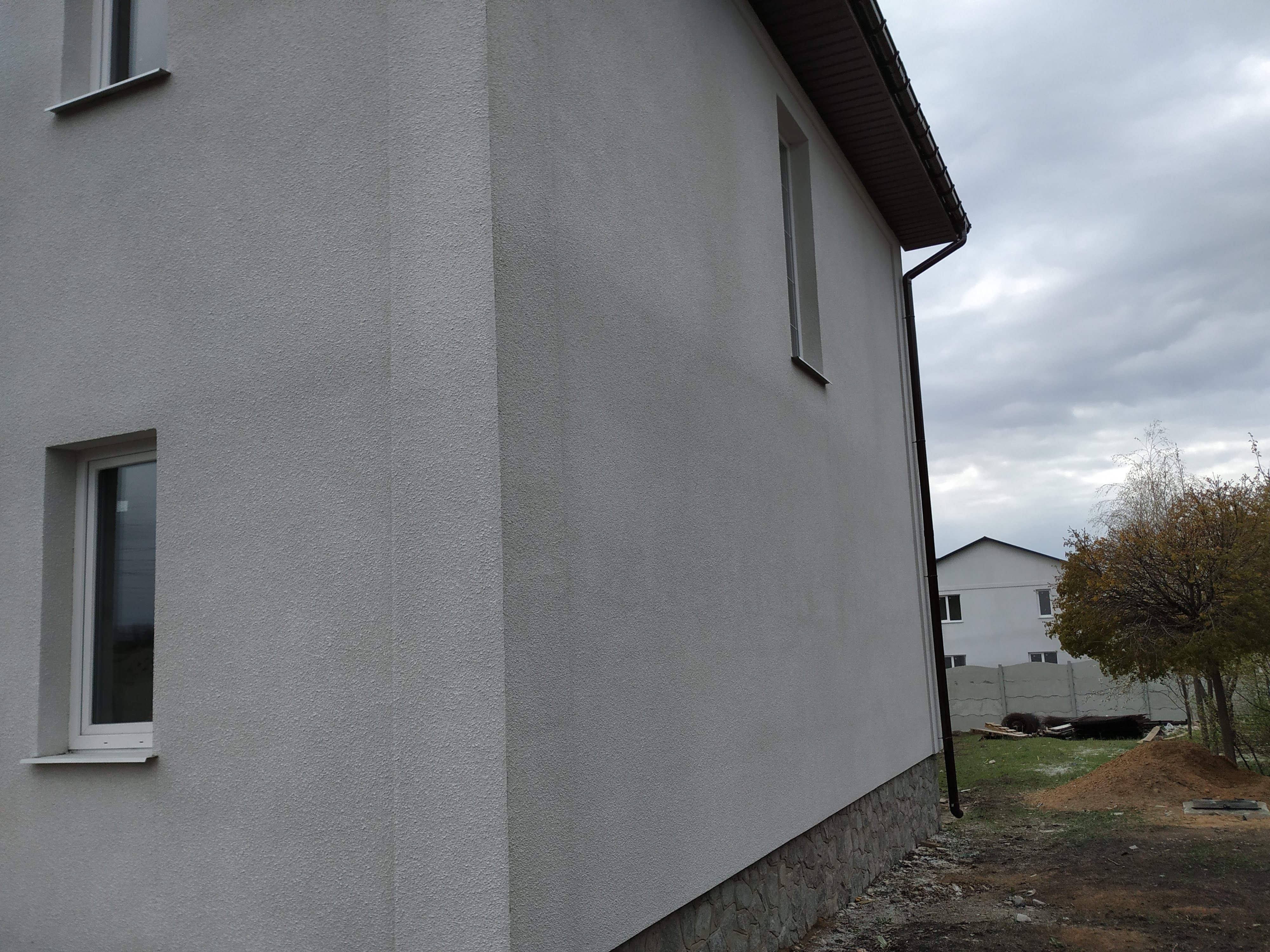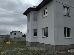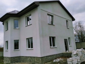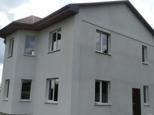 Фасад утеплен минеральной ватой 50 мм и покрыт декоративной штукатуркой.