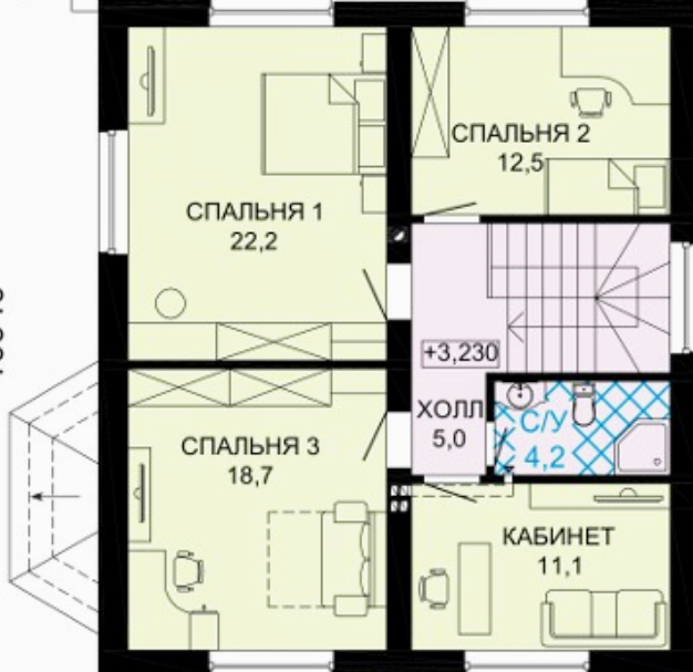 Помещения второго этажа: спальня хозяев, детская, спальня на 2-м этаже (или вторая детская), просторный санузел 2-го этажа, гардеробная.