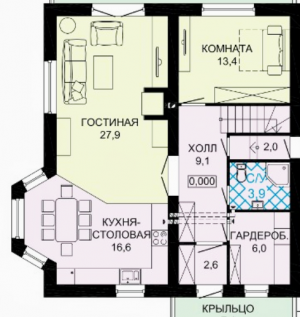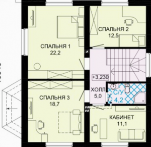Помещения первого этажа: прихожая-гардеробная, коридор, санузел 1-го этажа, спальня на 1-м этаже (обязательно при наличии пожилых членов семьи), светлая просторная кухня-гостиная.