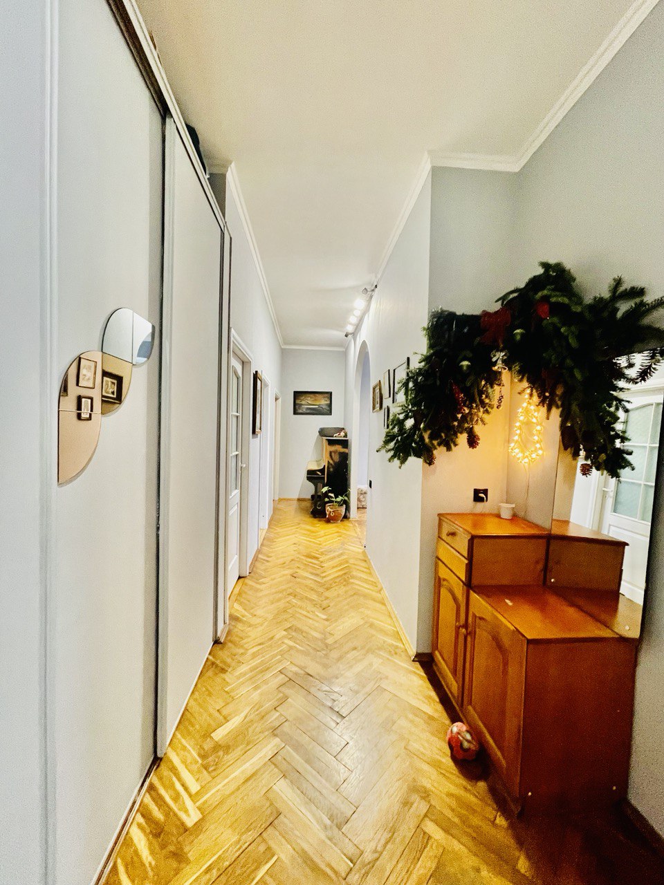 * Итак 4 комнаты, уютная кухня-столовая, лаконичный санузел, разделённые длинным коридором, паркетные полы все с «жилым» ремонтом, тут возможно сделать перепланировку, есть два балкона с прекрасными пейзажами древнего Киева.