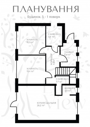 • 1 поверх – 2 кімнати, кухня-вітальня з коморою, санвузол.