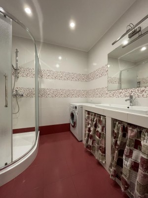 Комфорт забезпечили правильно підібрані матеріали в оформленні квартири і якісно виконані роботи. Побутова техніка не просто відомих, а з гарною репутацією брендів, зробила процес перебування на кухні задоволенням. Тепла підлога в ванній кімнаті дбає про ваше здоров’я. Клімат-контроль, крім технічних засобів, підтримує двостороннє розташування квартири, влітку не жарко, зимою тепло.