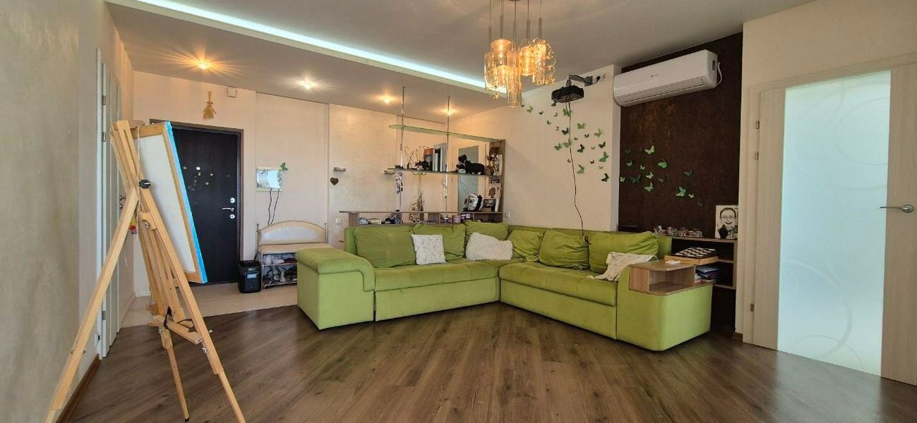 Виконаний євроремонт, функціональне перепланування, включає в себе: кухню-вітальню, 2 спальні, гардеробну та санвузол.