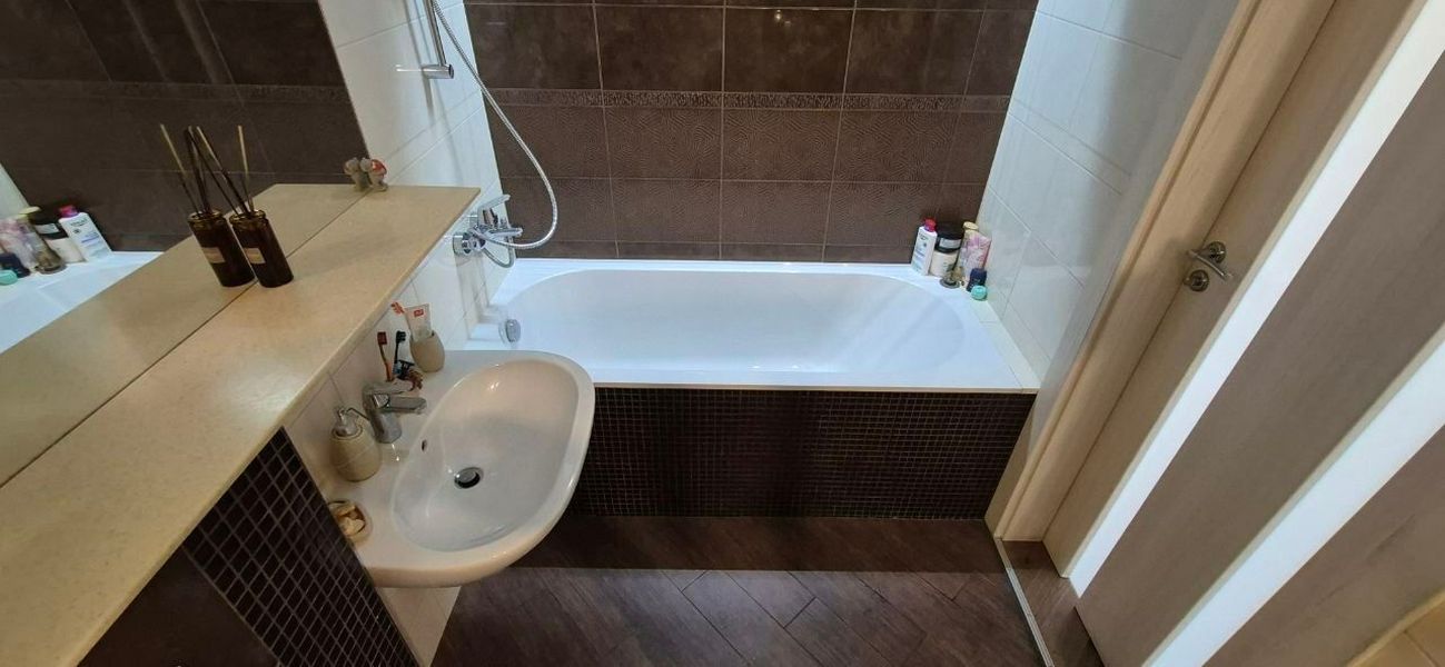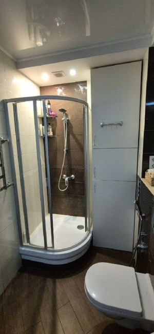 Санвузол суміщений з ванною та душовою кабіною.